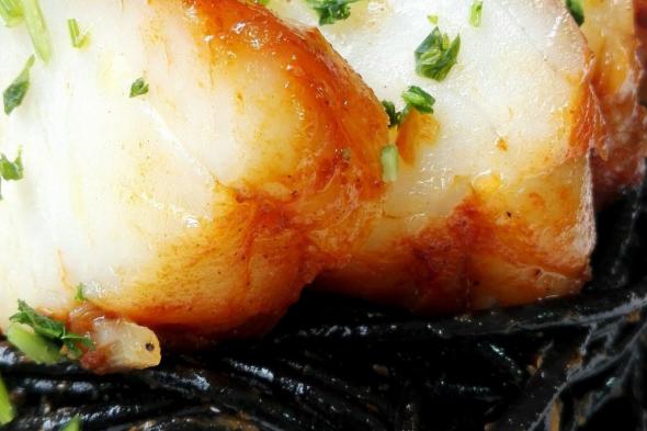 - Emplatado: Coloca en el fondo del plato un lecho de espaguetis negros y sobre el mismo, montados ligeramente unos sobre los otros el rape alangostado. Espolvorea con el perejil picado.