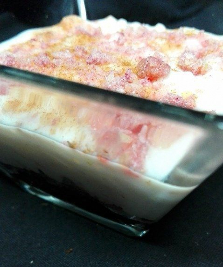 - Emplatado: En un vaso de cristal colocamos cucharada y media de mermelada. Cubrimos con la galleta picada y sobre la misma 4 o 5 buenas cucharadas de arroz con leche. Adornar con un poco de canela en polvo y espolvorear por encima una cucharadita de petazetas.