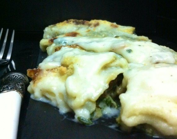 En reconocimiento a vuestro trabajo y sacrificio os dedicamos este plato, un regalo con mensaje. Una bechamel blanca y sin mácula, que cubre con su suave manto, como una delicada y protectora marea blanca, unos canelones de acelga con pasas y gambas. Verde esperanza, y no precisamente Aguirre.