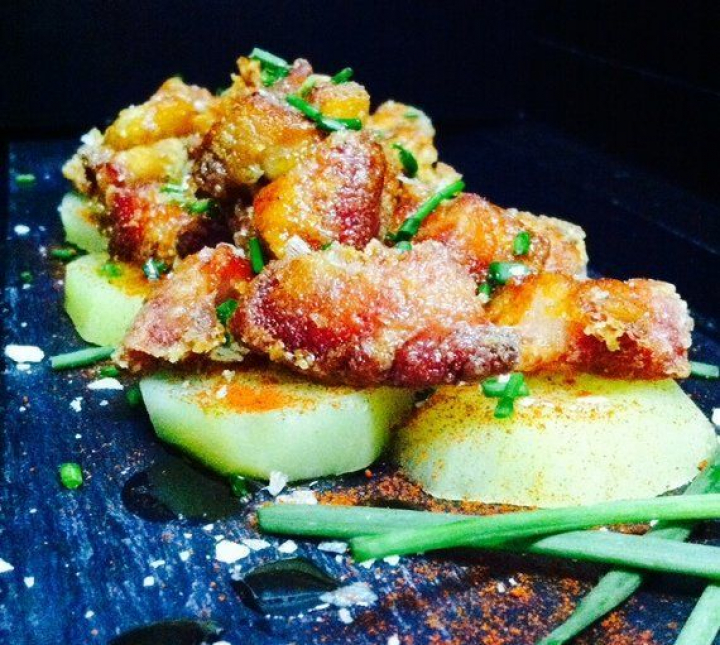- Emplatado: colocar las patatas de fondo, espolvorear de sal en escamas y pimentón y sobre las mismas los trozos de morro procediendo del mismo modo. Sobre el conjunto rociaremos con aceite de oliva virgen extra y esparciremos cebollino finamente picado.