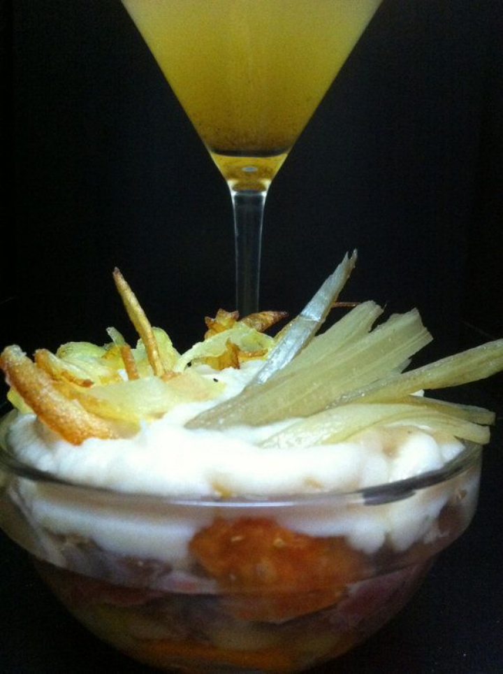 - Emplatado: colocar en el fondo las verduras, sobre las mismas las carnes. Verter caldo que lo cubra pero dejando la superficie seca. Con la manga pastelera cubrir con el hummus de alubia y rematar con patatas paja y cardo en tiritas. Servir el caldo aparte en copa de Martini muy caliente.