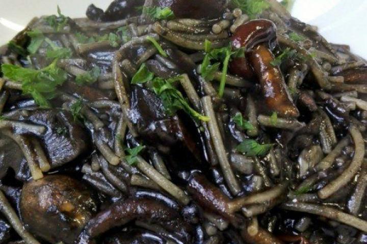 - Añadir las setas previamente lavadas. Sofreír. Incorporar los calamares y la bolsita de tinta. Remover para que se conjunten los sabores.