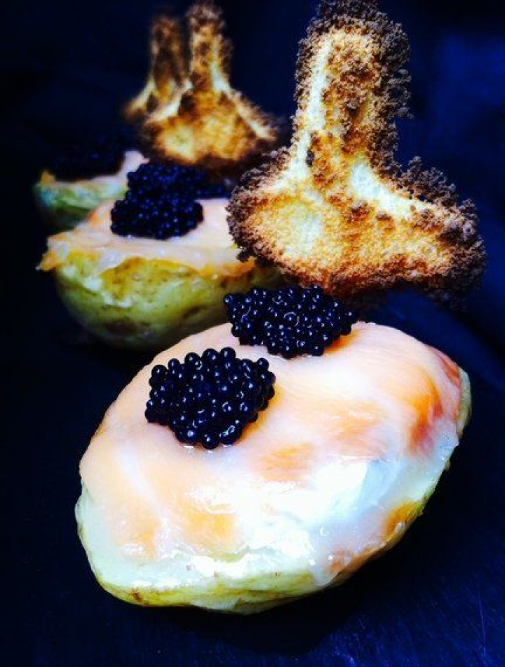 - Emplatado: Coloca un trozo de salmón encima de cada media patata que cubra todo su contorno, pero sin sobrepasarlo. Remata con una cucharadita de sucedáneo de caviar y pincha en un extremo una 'peineta' de parmesano. Sirve dos por persona y calientes.