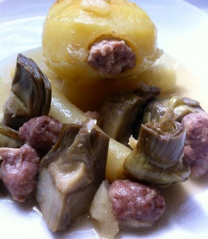 Pasado ese tiempo o cuando tú veas, añádele los restos de patata obtenidos en el vaciado (si lo has hecho con cuidado quedarán cilindros como espárragos gordos), las bolitas de longaniza y los cuartos de alcachofa escurridos y sofreír 2' ó 3'.