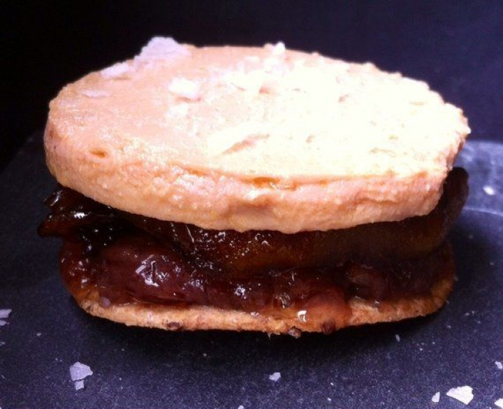- Emplatado: Corta la gelatina de Oporto en porciones iguales a las del pan tostado y colócala encima a modo de colchón de látex; sobre la misma, una "sábana" de manzana caramelizada (incluso si alguna tiene forma de gajo te servirá de almohada) y culminando, porciones de bloc de unos 4-5mm de grosor. Dale un golpe de calor en el horno o microondas y espolvorea por encima unas escamas de sal.
