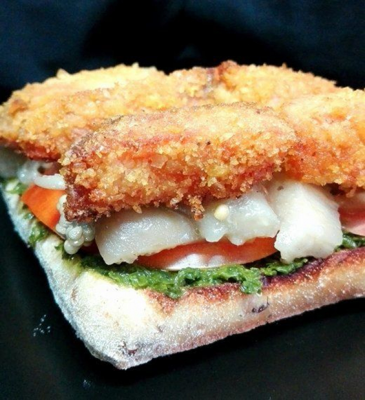 - Emplatado: Extiende sobre el pan una cucharada de salsa de pesto. Sobre la misma unas rodajas de tomate, encima la berenjena y culminando los trozos de salmón bien dispuestos.