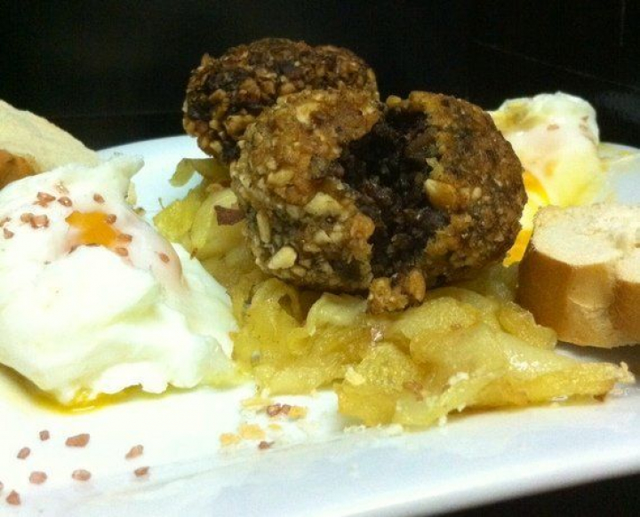 - Emplatado: coloca un cordón de patatas y sobre el mismo 2 ó 3 albóndigas de morcilla de Burgos, según tamaño, y un par de huevos escalfados a los lados custodiando el conjunto. Acompaña con buen pan de hogaza.
