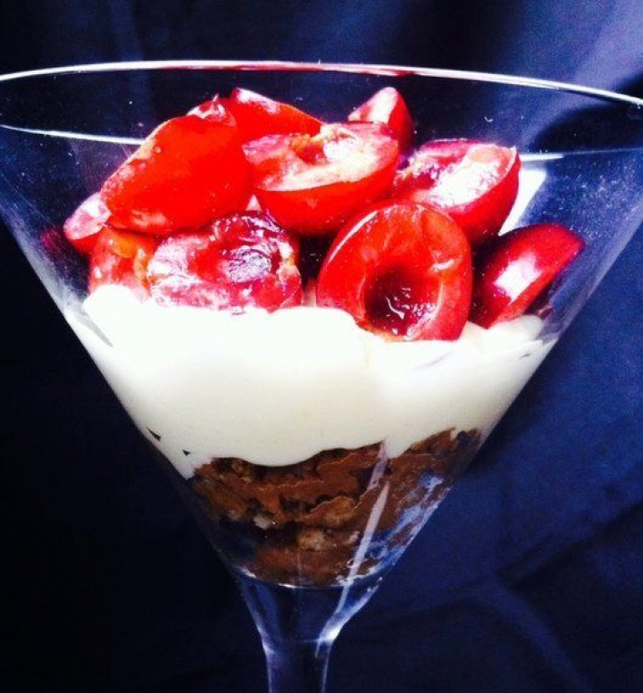 - Emplatado: en copa alta o vaso transparente, dispón, por este orden, una cucharada de pasta de rosegón, dos buenas cucharadas de mascarpone y sobre él las cerezas.
