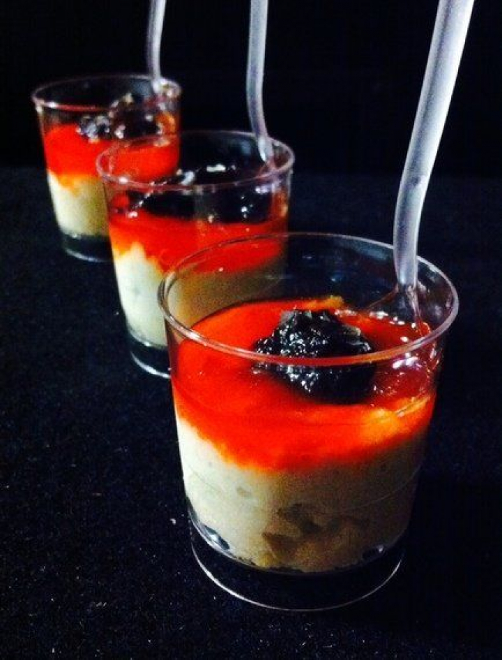 - Emplatado: disponer en vasitos la brandada llenando unos 2/3 de su volumen. Sobre la misma 2 cucharadas de mermelada de pimiento y culminando la cucharadita de olivada negra.