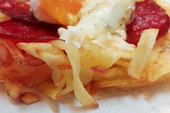 - Emplatado: Introducir en el nido de patatas los trocitos de chorizo y encima el huevo escalfado. Espolvorear con un poquito de escamas de sal y unas gotas de aceite de oliva virgen...Rompe el huevo, mézclalo todo...Umm...