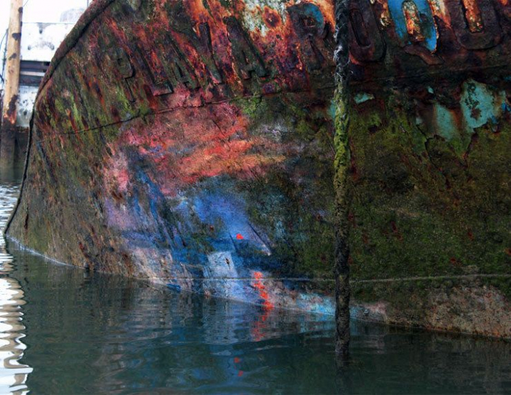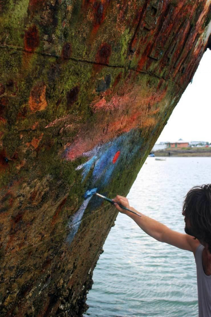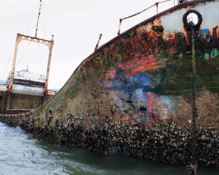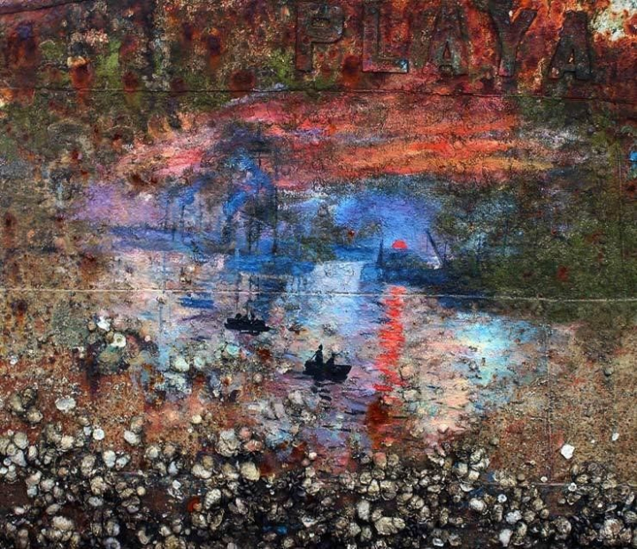 La acumulación de percebes en el casco oxidado del antiguo barco forma parte de la costa rocosa donde se inserta este tributo impresionista a Monet realizado por el artista callejero español Pejac. Aquí, en la costa cántabra, se balancea con la marea baja mientras recrea una escena de hace aproximadamente 140 años en el puerto de Le Havre, en Francia.