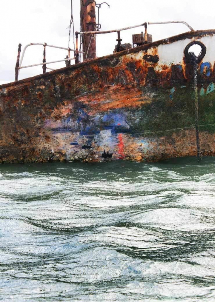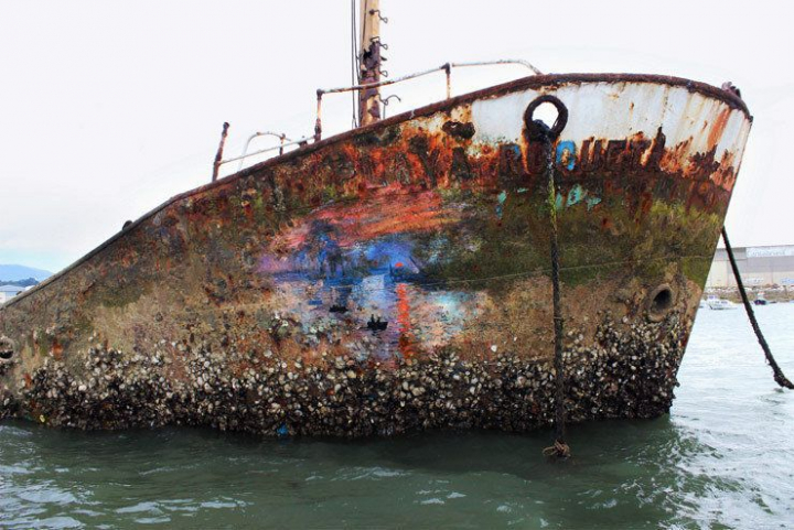 No obstante, lo que hace tan significativo al homenaje de Pejac es la especificidad del espacio, sobre una embarcación. "Creo que el casco de metal oxidado de este barco semihundido da vida a la imagen. Con la subida y bajada diarias de la marea del Cantábrico, la obra puede estar por encima o por debajo del agua", explica. "El mar actúa como el telón en el escenario de un teatro".