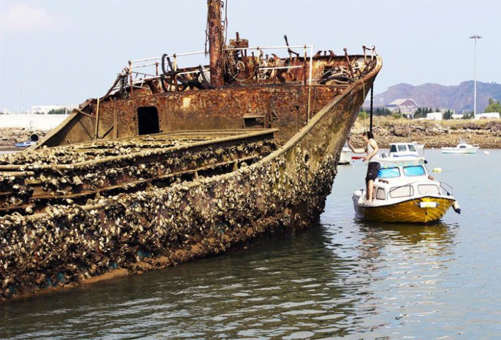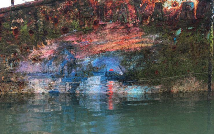 "El casco de metal oxidado de este barco semihundido da vida a la imagen. Con la subida y bajada diarias de la marea del Cantábrico, la obra puede estar por encima o por debajo del agua. El mar actúa como el telón en el escenario de un teatro".