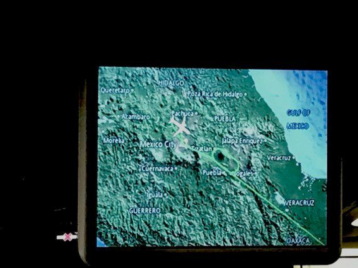 Luego llegó el vuelo en el que el avión hizo un doble looping, perdiendo tiempo en el aire porque no tenía pista. Uno viaja a la capital como si fuera en bus turístico en el que ves el centro del país desde el aire. Al menos esta vez pasó dos veces por Puebla y casi llegó a la sierra de Hidalgo en sus vueltas en el cielo a la espera de que le dijeran que podía descender. La foto de los dos volcanes atardeciendo, uno se entretiene tomando instantáneas de poca calidad con el móvil, la compañía tuvo la decencia de no cobrármela aparte como extra. Pongan otros casi 20 minutos de pérdida.