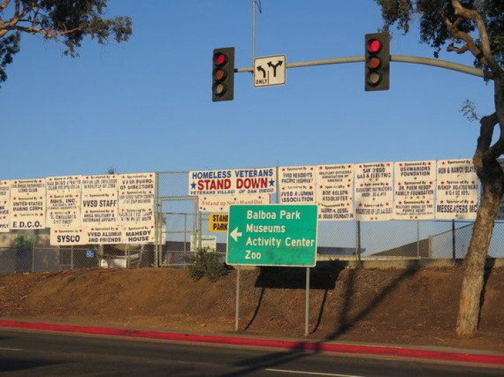 Decidimos después ir a visitar el Balboa Park y en el camino, en una larga cuesta, vemos decenas de personas tiradas en la calle y algunas tiendas de campaña. Hay muchos carteles que parecen estandartes y en el centro hay uno en el que se lee: "Villa de veteranos sin techo".