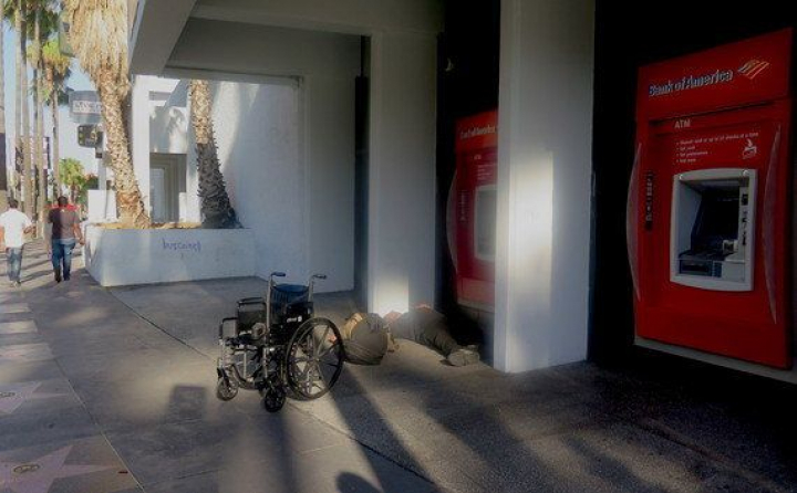 Hay un hombre tirado en la acera junto a su silla de ruedas en Hollywood Boulevard. Ambos, silla y hombre, lo hacen en escorzo, dándose la espalda, bajo la escasa sombra de dos cajeros automáticos del Bank of America. Nadie mira, ni se detiene, es sólo una persona más que se consume en la calle. Son muertos, vivos, pero muertos.