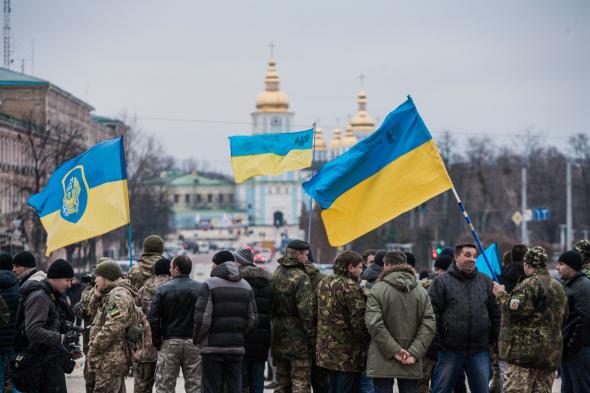 Manifestantes en la plaza del Maidán, en Kiev, en el aniversario de la revolución.