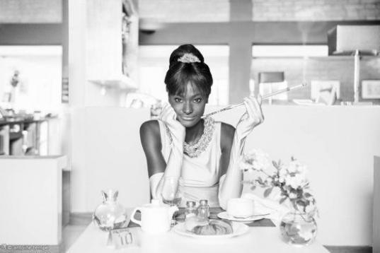 El traje negro de Audrey Hepburn en Desayuno con diamantes se vuelve blanco en la imagen creada por Tempé, contrastando así con la piel de la modelo africana. Diop y Tempé juegan a reconstruir un mundo lúdico de ficción sobre la ficción, jugando con la identidad.