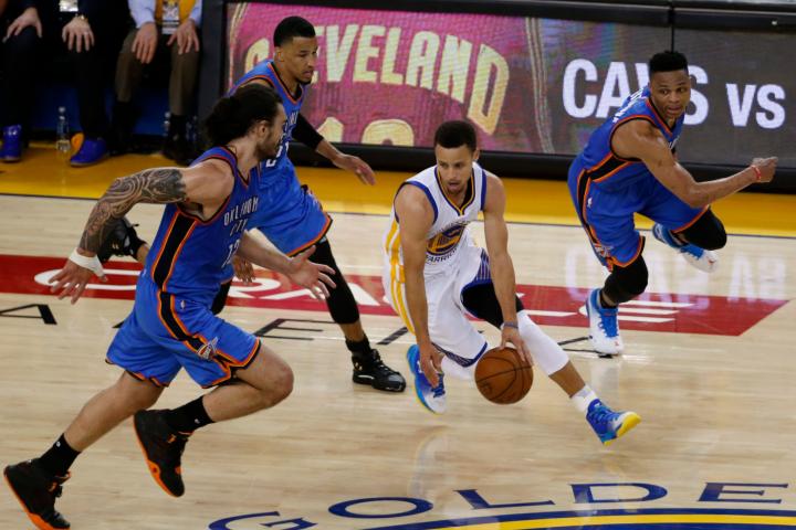 La serie adquiría tintes épicos -y dramáticos para los intereses del equipo perdedor-. Una canasta de Curry daba el mando del encuentro a los Warriors (62-61), hasta que Ibaka y Durant devolvieron el liderato al equipo de casa. Kerr tuvo que campear el temporal pidiendo un tiempo muerto y confiando el futuro de su equipo a los Splash Brothers... Y a Draymond Green. Un nuevo triple de Thompson -con el que igualaba el récord en un partido de playoffs (9)- enjuagó la ventaja local (89-84). Los Thunder se enredaban en ataque ante la defensa coral -con especial mención a Iguodala- de Golden State, y en el otro lado de la cancha Curry se hacía el dueño y señor del encuentro anotando canastas memorables delante de cualquiera que osara defenderle o tenderle una trampa. Sus triples y su manejo de balón desquiciaron a OKC. Primero, un lanzamiento sideral que igualó el choque (99-99). Y, después, tras un nuevo triple de Klay Thompson (el undécimo, con el que rompía el récord), puso el sello definitivo al enfrentamiento. Los nervios atenazaron a los Thunder, que se vieron superados por la situación.