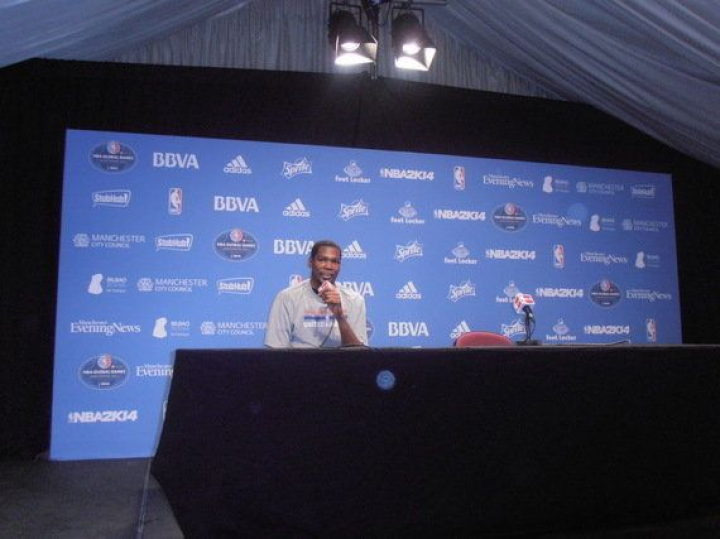 Kevin Durant habla con los medios en la rueda de prensa posterior al partido. Foto: J.M.