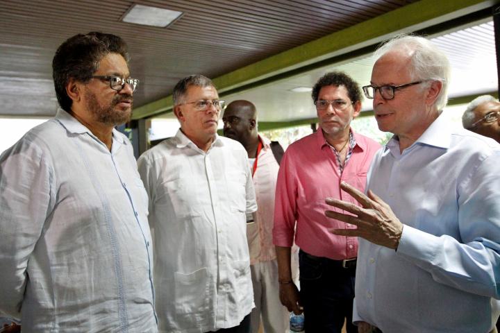 El enviado de Estados Unidos para el proceso de paz de Colombia, Bernard Aronson (d), habla con el segundo jefe de la guerrilla de las FARC y líder de la delegación de esa guerrilla en Cuba, Luciano Marín (i), alias Iván Márquez/EFE.