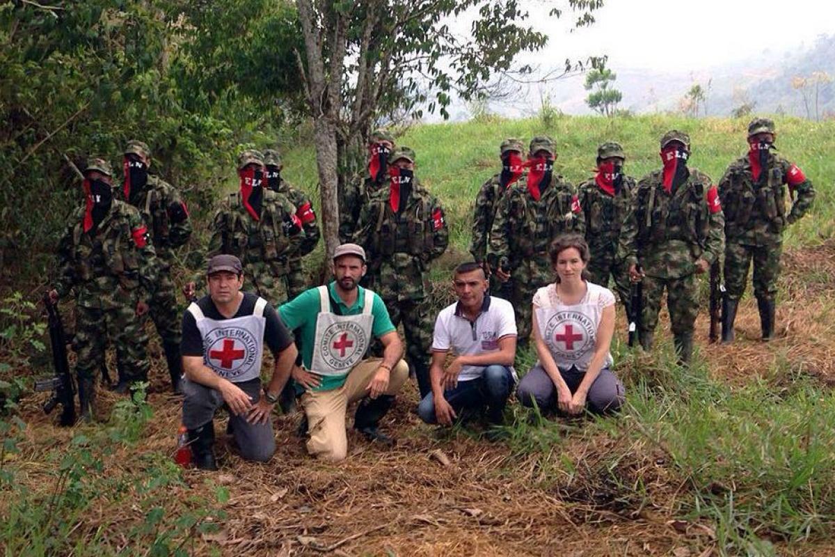 Foto cedida por el Comité Internacional de la Cruz Roja (CICR) donde se ve al patrullero de la policía colombiana Héctor Germán Pérez Monterroso (2d) acompañado por integrantes de CICR tras su liberación por parte del Ejército de Liberación Nacional EFE