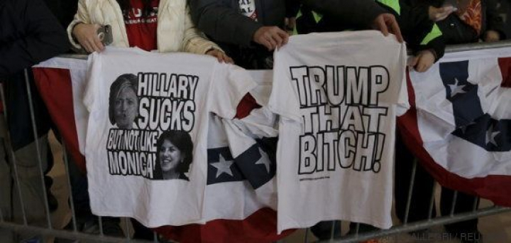 En un juego de palabras con el término 'suck', que significa 'apestar, dar asco' y 'chupar, hacer una mamada', el lema de la camiseta de la izquierda podría traducirse como: 'Hillary da asco, pero no la chupa como Monica [Lewinsky]'. El segundo eslogan, en el que la palabra 'Trump' se utiliza con la acepción de 'sobrepasar', significa: 'Supera a esa perra'.