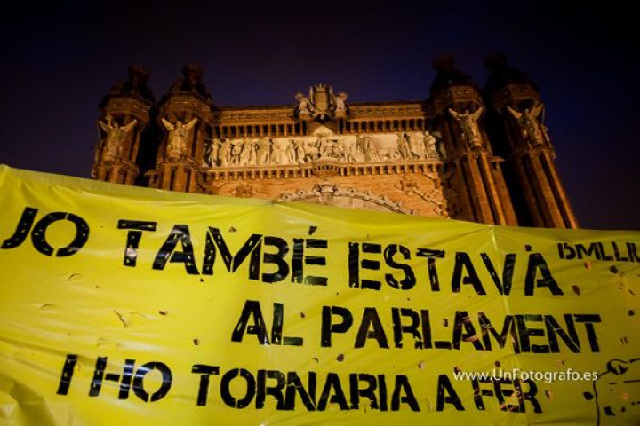 Miles de personas rodearon el Parlament de Catalunya el 15 de junio de 2011 para intentar frenar los presupuestos con los que la Generalitat concretaba el desguace del sistema de protección público... La pancarta dice: "Yo también estuve en el Parlament. Y volvería a hacerlo". Probablemente, yo también.