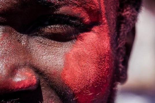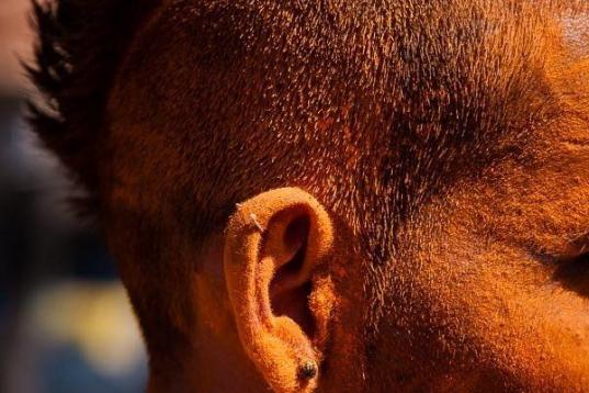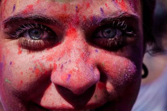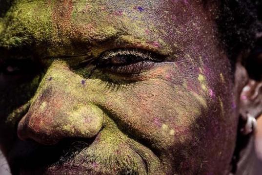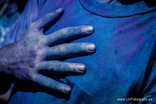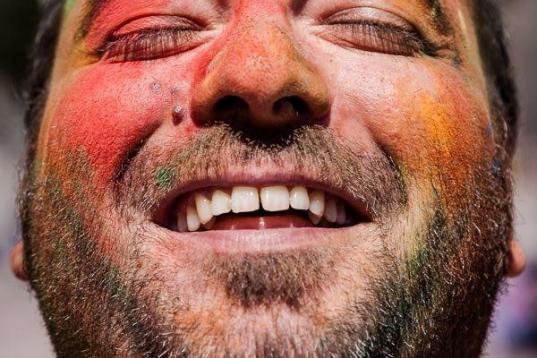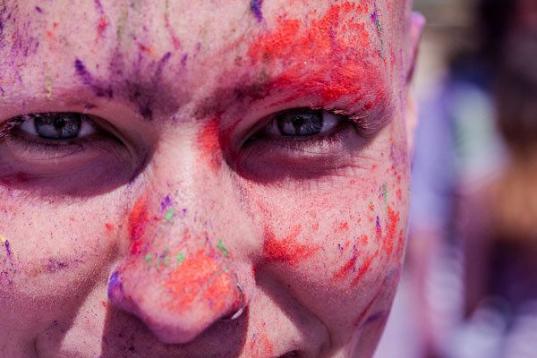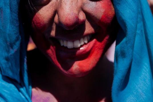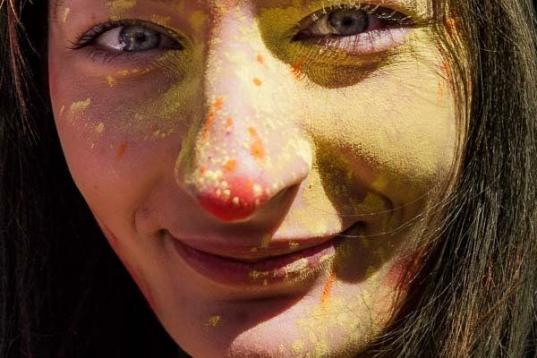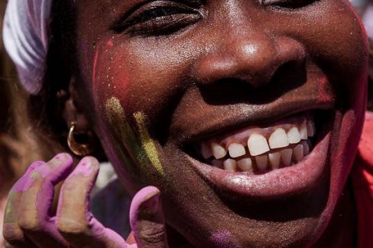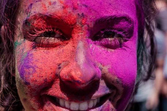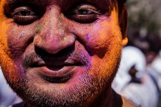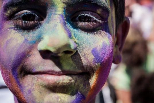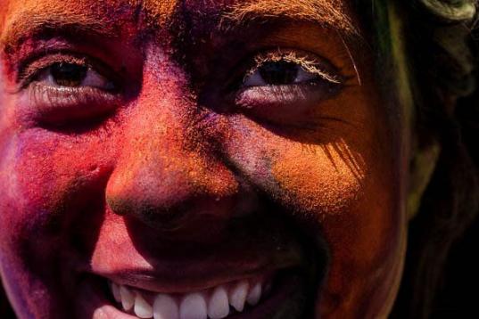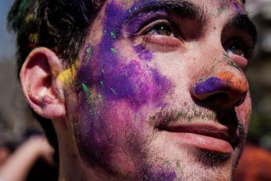 [Retratos fotográficos tomados el 14 de abril en la rambla del Carmelo (Barcelona), muy lejos de la India, donde el Holi es, desde hace siglos, un festival-institución que celebra el tiempo de cosecha, la llegada de la primavera y, a modo de efímera metáfora, representa una sociedad sin castas, etnias, religiones o clases sociales, una simplificación del inmenso y complejísimo puzzle que es la India. Los intensos colores, fabricados antaño con flores de plantas medicinales, simbolizaban remedios ayurvédicos contra enfermedades provocadas por el cambio de temperatura estacional. Hoy, más de veinte siglos después, algunos alertan de la toxicidad de los polvos utilizados, el impacto medioambiental de las hogueras previas y las agresiones sexuales cometidas durante el caos indisoluble a la masiva celebración. ]