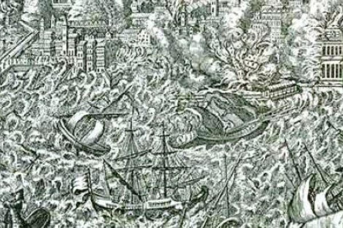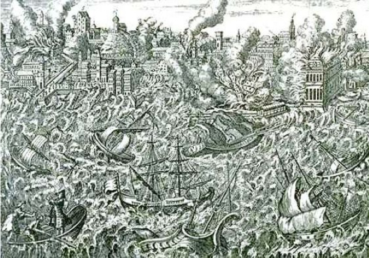 La ciudad de Lisboa siendo arrasada por el Tsunami del 1 de noviembre de 1755.