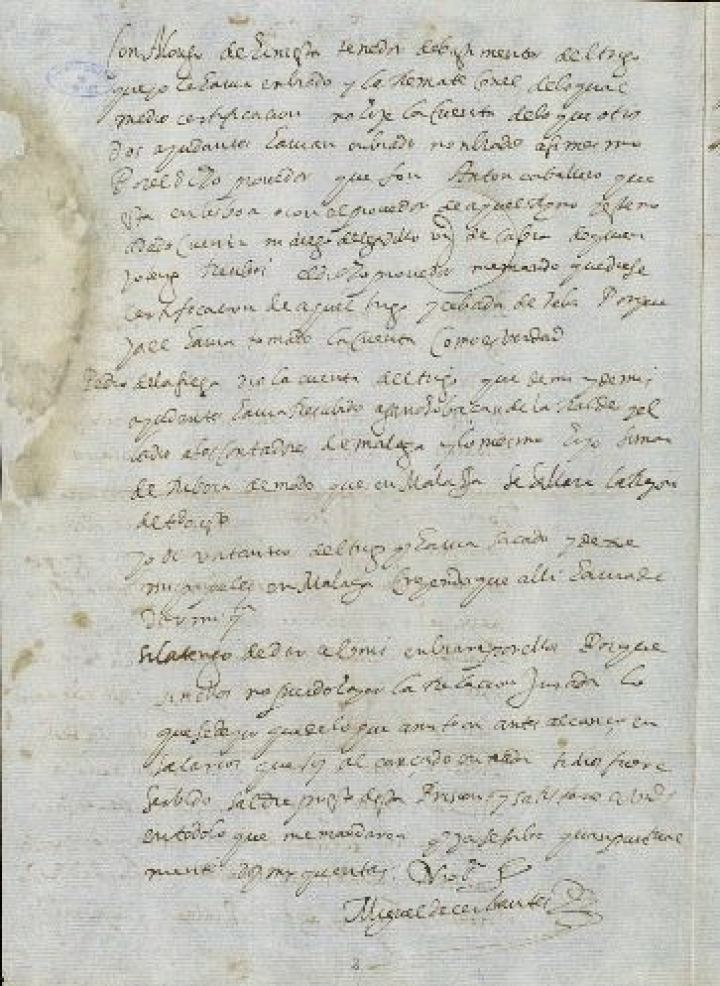En otro documento, ya más adelante en su vida, tiene que responder a las dudas de la Hacienda, que le acusa de que las cuentas de su trabajo como recaudador de impuestos no están claras (es la segunda de las cartas que hay dos párrafos más abajo). Por eso le piden una declaración jurada sobre unos asuntos, y él responde que no puede disponer de esos documentos que le piden porque está en la cárcel. "Y entonces, él dice: 'En cuanto salga, le mandaré las cuentas, porque ya sabe usted que puntualmente las mantengo al día", parafrasea jocosamente Elisa Ruiz ante los devaneos fiscales de Cervantes.