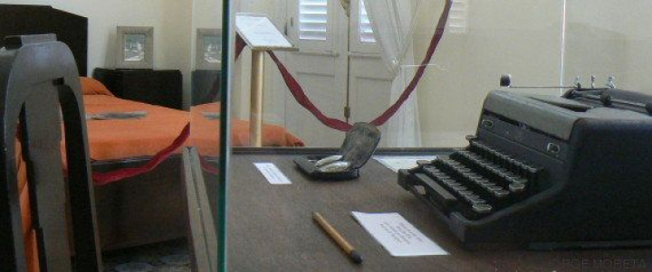 Hoy es un minúsculo museo de doce metros cuadrados dedicado al genio. Su máquina, que ya no escribe, está encerrada en una urna de cristal y renuevan las fotos anualmente para, imagino, que la guía no enloquezca y renueve su discurso.