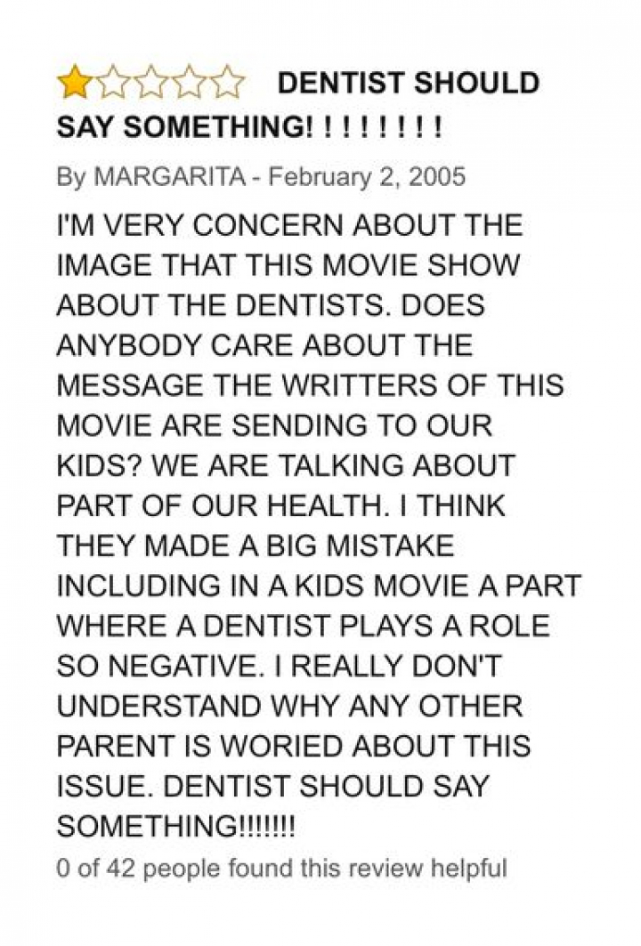 "Estoy muy conmocionada sobre la imagen que esta película enseña de los dentistas. ¿Alguien se preocupa por la imagen que los escritores de esta película transmiten a los niños? Estamos hablando de una parte de nuestra salud. Creo que cometieron un gran error incluyendo en una película de niños el papel de un dentista tan negativo. Realmente no entiendo por qué otros padres [no] están preocupados por este tema. Los dentistas deberían decir algo!!!!!!!".