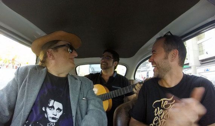 Se anima a imitar en el coche a Elvis a pesar de las flemas que le persiguen durante la entrevista. Se suelta con el sugerente Love me tender, después de calzarse en la cabeza un sombrero estilo cocodrilo Dundee con símbolos aztecas de su querido México. No hace falta mucho más para que se arranque mientras nos acercamos a la sorpresa de un amigo, fan de Gurruchaga. Le compuso una canción que ahora le toca un poco apretado con la guitarra en la parte de atrás del plató mini escenario. No damos más pistas, sean todo oídos y escuchen a Gurruchaga, que está en su salsa.