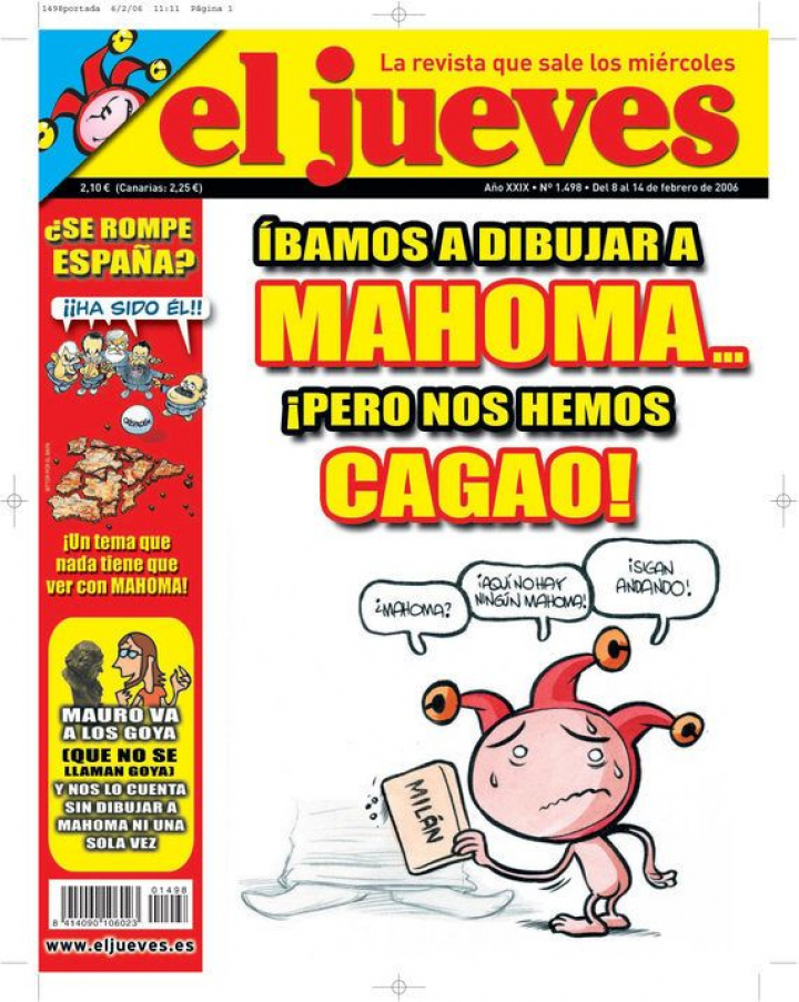 En EL JUEVES vivimos una situación parecida hace unos años cuando el asunto de las caricaturas de Mahoma. En el consejo de redacción decidimos publicar un dibujo de Mahoma en portada y mientras lo estábamos elaborando (nuestro oficio de dibujante es muy artesanal) empezamos a oír en los informativos que se estaban asaltando embajadas occidentales y que había víctimas mortales. Alguien planteó: "Oye, y si después de publicar nuestra portada empiezan a asaltar embajadas españolas y muere alguien, ¿qué?" Se nos cayó el lápiz de la mano y optamos por hacer nuestra célebre portada "Íbamos a dibujar a Mahoma pero nos hemos cagao...". No nos arrepentimos, pensamos que hicimos lo correcto en aquel momento, pero eso no quita para que el editor de Charlie Hebdo tenga toda nuestra simpatía y solidaridad.
