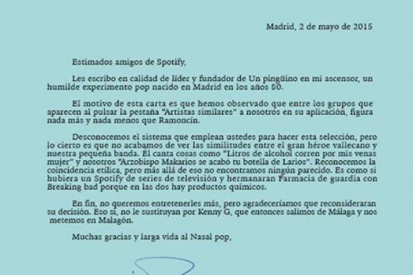 Carta de 'Un pingüino en mi ascensor' a Spotify
