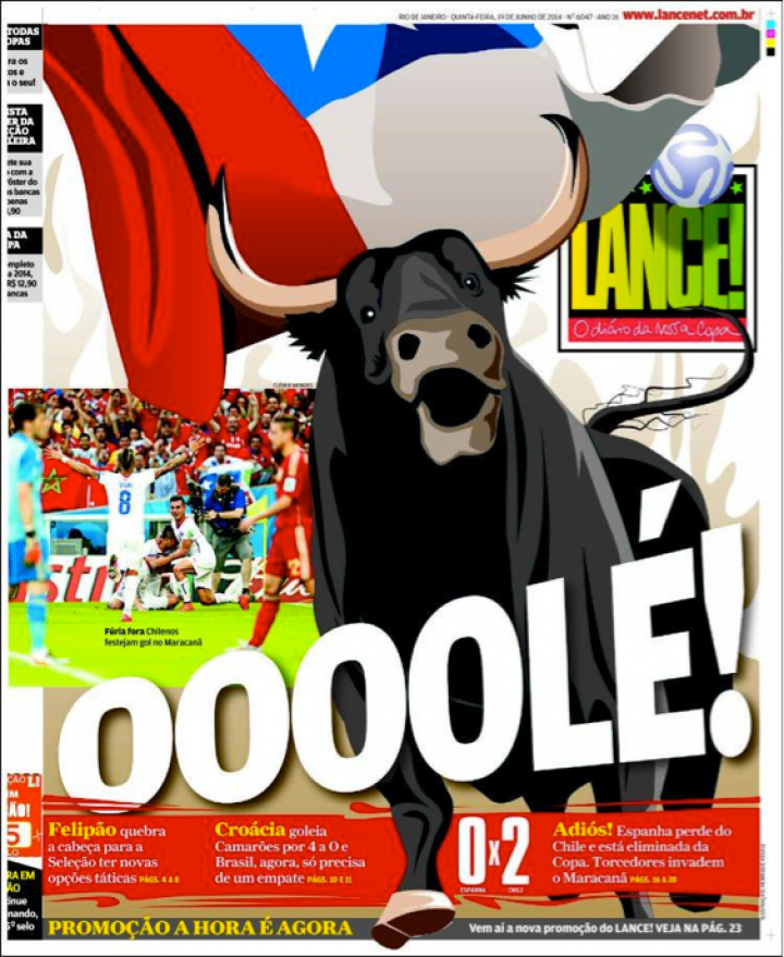 Esta es la metáfora que ha elegido el principal diario deportivo de Brasil, Lance, para ilustrar su portada: un descomunal toro arropado por la bandera de Chile, sobre el que se lee el titular Oooolé!. "¡Adiós! España pierde contra Chile y está eliminada de la Copa. Los aficionados invaden Maracaná", subtitula junto al resultado. Dentro, una viñeta de un toro cubierto por una sábana roja que dice: "Eliminado. Rojo de vergüenza... el fantasma del maracanazo rojo". Finalmente, más adelante, "Adeus, tiki-taka".