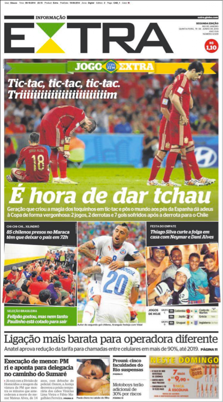 En Extra, sobre una foto de los derrotados jugadores españoles, se ve, en referencia al tiquitaca, un "Tic-tac, tic-tac, tic-tac. Triiiiiiiiiiiiiiiiim. Es hora de dar el adiós". Subtitula así: "La generación que creó la magia del toque en el tiquitaca y puso al mundo a los pies de España da el adiós a la Copa de forma vergonzosa: dos partidos, dos derrotas y siete goles encajados tras la derrota contra Chile".