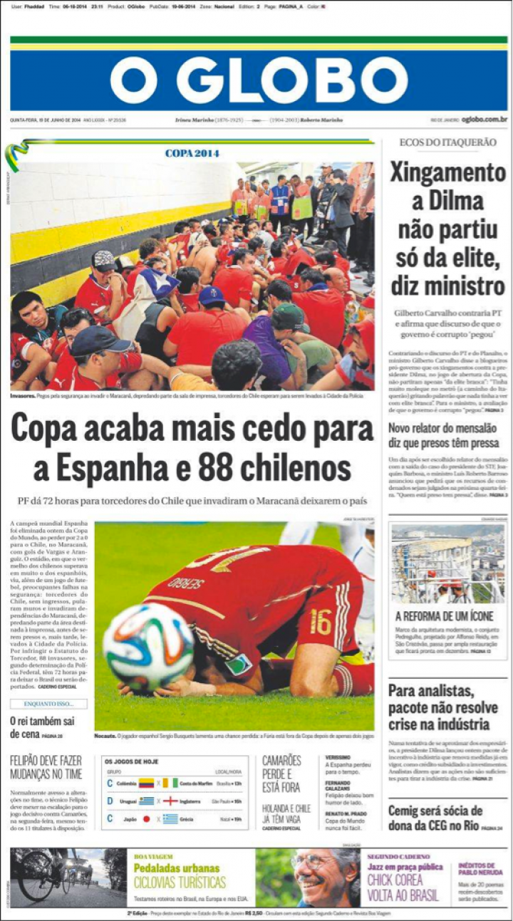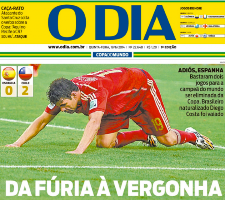 Finalmente, O dia tiene por portada a Diego Costa a cuatro patas. "De la furia a la vergüenza". "Adiós, España. Bastaron dos partidos para que la campeona del mundo fuera eliminada de la Copa. El brasileño nacionalizado Diego Costa fue abucheado". En la página siguiente, llena de fotos de la afición chilena, se afirma: "Los chilenos dan olé a España y cubren Río de rojo".
