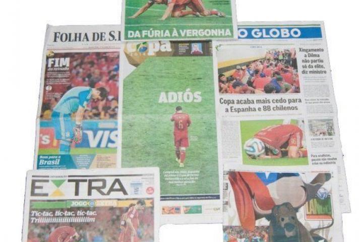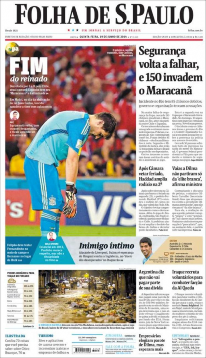 Folha de S. Paulo, junto a un Casillas cabizbajo, sentencia: "Fin del reinado". "Derrotada por 2 a 0 por Chile, la actual campeona España tiene su "maracanazo" y es eliminada. En Madrid, el día de la abdicación del rey Juan Carlos, la afición da las gracias al equipo con aplausos". El análisis de portada achaca la derrota a la edad, el desgaste y el conocimiento de su juego que tienen los rivales. En páginas interiores, el apartado sobre la Copa toma como imagen a Iniesta, solo sobre el campo, lamentándose por la derrota. "Adiós", se lee en mayúscula. "Campeona en 2010, España dice adiós a la Copa de forma melancólica y ve el fin de su mejor generación". En mitad del diario, a dos páginas y sobre la imagen de un enorme Diego Costa y de la desolada afición española, "Maracanazo".