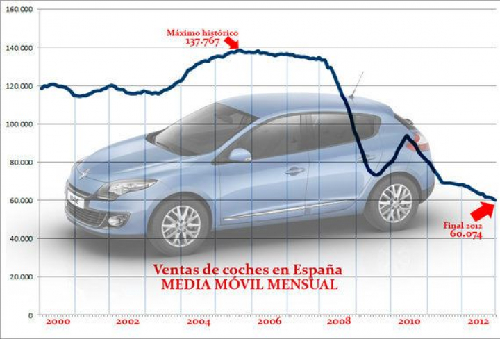 No es ninguna sorpresa; se venía anunciando desde hace muchos meses. La cifra de ventas de automóviles alcanzada en 2012 es la más baja de los últimos 20 años. El automóvil es uno de los "falsos indicadores" económicos más revelador. Las familias dejan de comprar automóviles antes incluso de que comiencen los verdaderos problemas.