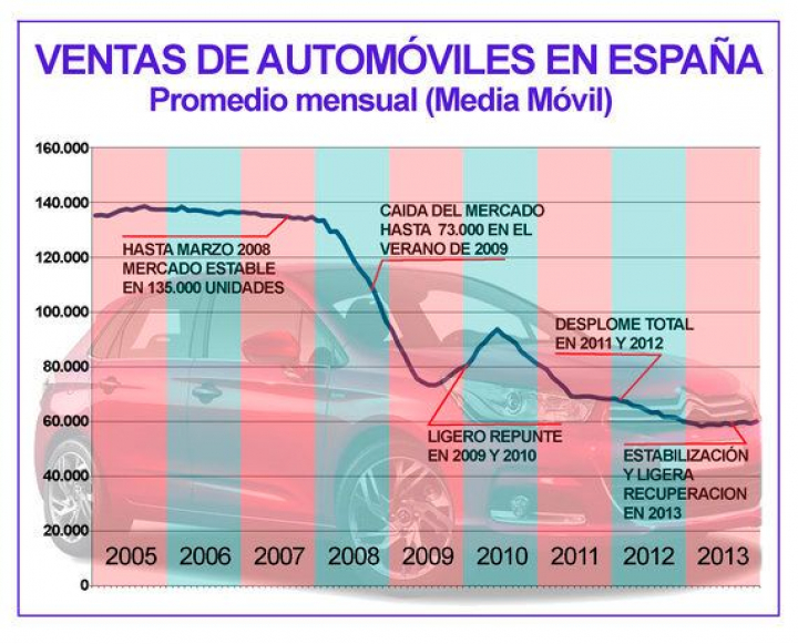 En el cuadro que se adjunta se recoge la evolución mensual de las ventas de coches (turismos y todo-terreno) desde 2005 hasta 2014. Una curva con los datos de la media móvil, que es la manera en que se reflejan las cifras sin las variaciones estacionales. Hasta el primer trimestre de 2008 los concesionarios españoles vendían en el entorno de los 135.000 coches de promedio mensual. A partir de entonces y durante dos años, el mercado se desplomó. Las ventas cayeron mes tras mes, alcanzando su mínimo (73.000 unidades) en el verano de 2009. Hasta el verano siguiente hubo un repunte también bastante evidente, gracias a los planes de incentivación de las ventas. Se recuperó hasta 93.600 unidades en junio de 2010, pero fue solo un espejismo porque el mercado desde entonces y durante otros dos años y medio no ha dejado de caer, hasta que en la primavera de 2013 parece que se ha estabilizado, en el entorno de las 60.000 unidades mensuales (720.000 anuales). A ver qué ocurre a partir de 2014 y cómo responden los planes de ayuda a la compra.