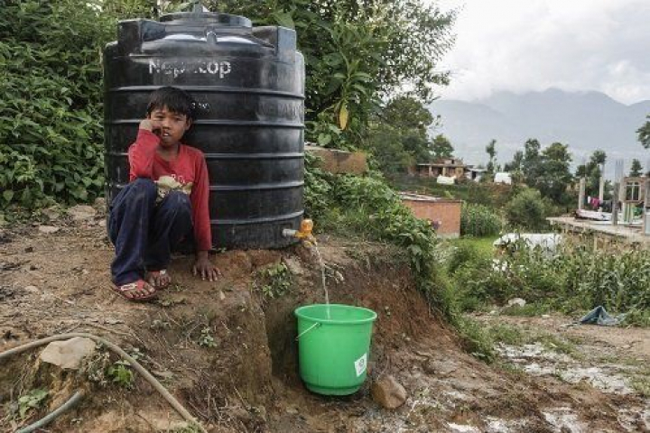 Dil Bahadur, de 12 años, se sienta junto a un tanque de agua en el pueblo de Burunchili en Katmandú el pasado 30 de agosto/ SAM TARLING/OXFAM.