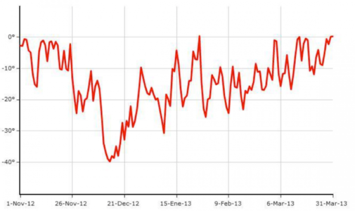 El año pasado, las temperaturas medias desde el 1 de noviembre de 2012 hasta el 31 de marzo de 2013 nunca superaron los 0ºC y la temperatura más baja si situó por debajo de los -40ºC. En diciembre o enero, por ejemplo, en muy pocas ocasiones la temperatura sube por encima de los -20ºC.