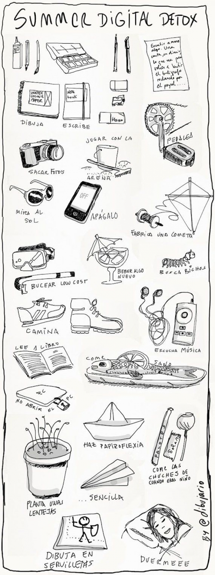 Una muestra de esta exigencia de estar siempre conectado es que cada vez hay más gente que busca hoteles con conexión wifi , incluso cuando se van a una casa rural, pero también hay personas que buscan todo lo contrario: auténticos "retiros espirituales" donde desconectar y olvidarse del mundanal ruido, o como poco, intentan desconectar siguiendo algunas sabías recomendaciones, como las que planteaba @dibujario este verano en su infografía Summer Digital Detox.
