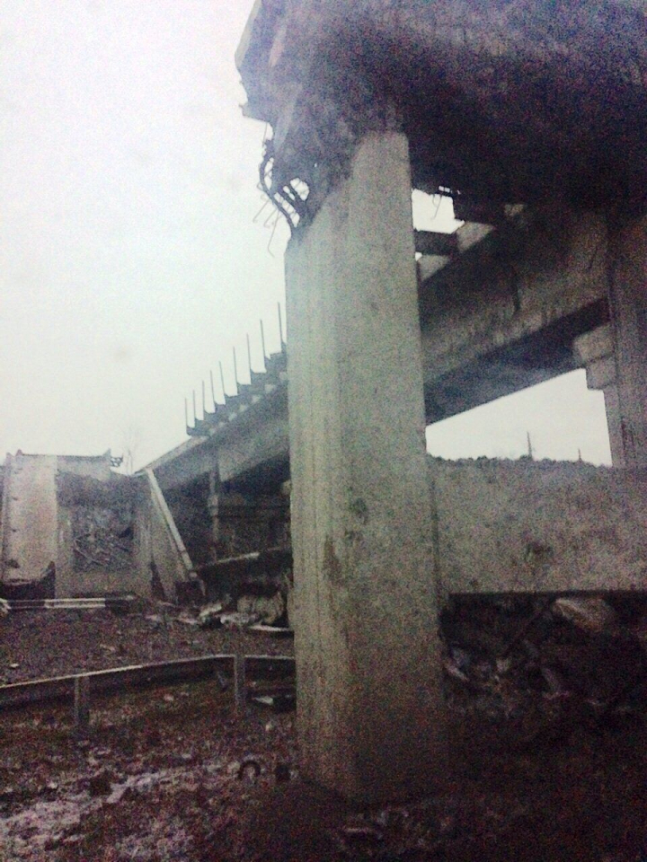 El tema es que en los acuerdos de Minsk se acordó, entre otras cosas, retirar la artillería de ambas partes. Aunque al parecer, según cuenta la gente de aquí, lo que hacen es retirarla, pero solo un poquito, o esconderla, y cuando pasan los observadores (los de la OSCE y otros que los hay por centenares, casi más que combatientes) con sus cascos y chalecos blancos, pues lo vuelven a des-retirar y a des-esconder y otra vez a tirar cohetes. Bueno, a lo mejor es que estaban preparando la fiestas del pueblo y era para tirar cohetes de verdad. (Foto: Puente destruido a la salida de Donetsk camino de Ktrasny Partizan. JOTA ECHEVARRÍA)