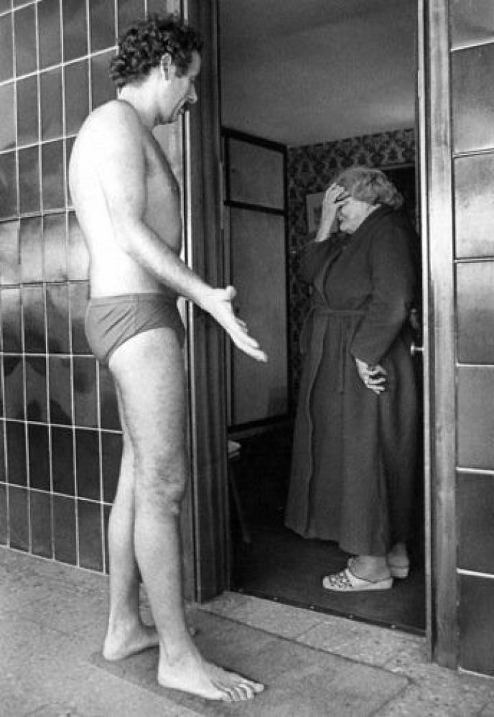 La primera, en blanco y negro, representa uno de los momentos fundacionales del periodismo gonzo en España. En febrero de 1981, el reportero Luis Cantero se hizo pasar por un pobre viandante al que habían atracado en la carretera de Esplugues y recorrió esa localidad barcelonesa pidiendo la caridad de vestir al desnudo. En ocasiones, como se aprecia en la foto y contaría después, levantó el estupor del vecindario.
