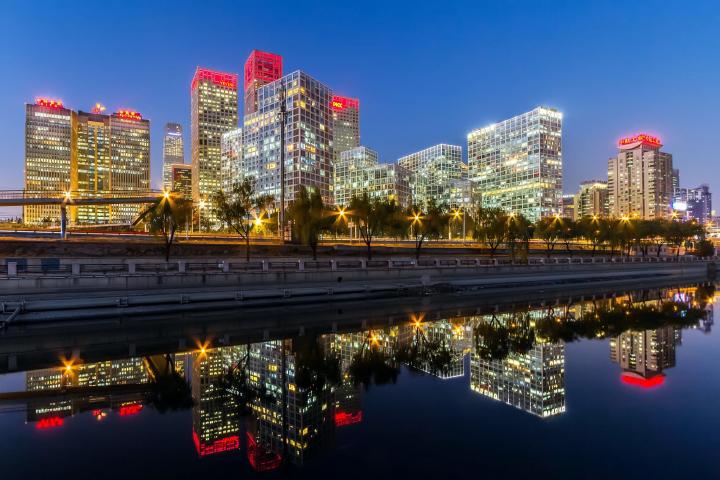 Vista nocturna del CBD (Central Business District) en Beijing.