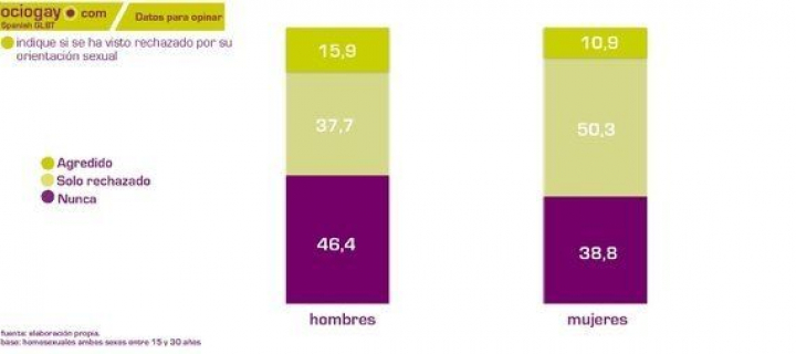 Las cifras más preocupantes, y quizás las que vayan descendiendo más lentamente de lo debido, son aquellas relativa a la homofobia. El 15,9% afirma haber sido agredido por ser homosexual alguna vez, lo que sumado al 37,7% que se ha sentido rechazado, nos da como resultado que más de la mitad de los homosexuales sufre algún tipo de discriminación. Quizás por ello el 83,9% de los encuestados salen del armario de los 18 a los 25 años, una edad un tanto tardía.
