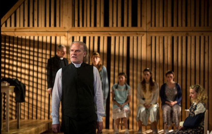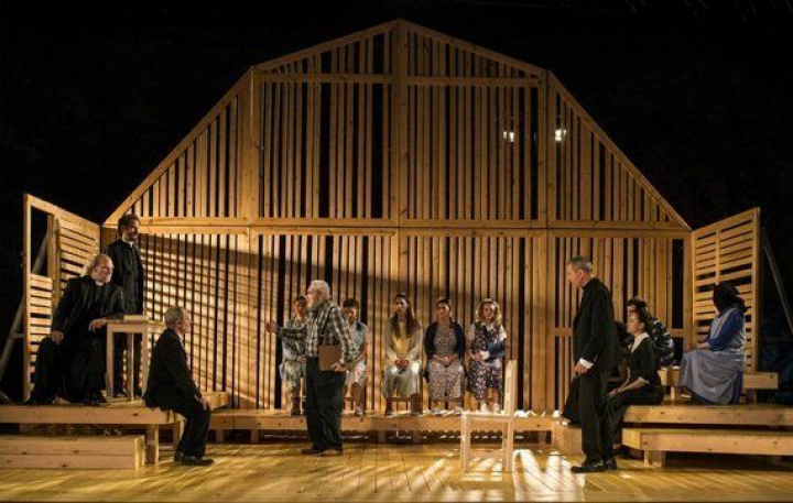 La escenografía es otro de los grandes aciertos de la obra: está basada en la imagen kinética de la construcción bíblica del templo presente en el Antiguo Testamento (1 Reyes 6) y utilizando las ecos cinematográficos de la epopeya arcádica del Western en el que los habitantes de un pueblo construyen su iglesia de madera. Frente a estos poderosos iconos, que indudablemente están dispuestos para emocionar al público, el desenlace escénico de la obra contrapone una dura última imagen. La iglesia que hemos visto construirse ante nuestros ojos, se ha convertido en un patíbulo sacrificial en el que los habitantes de Salem celebrar la muerte de la voz de la razón.